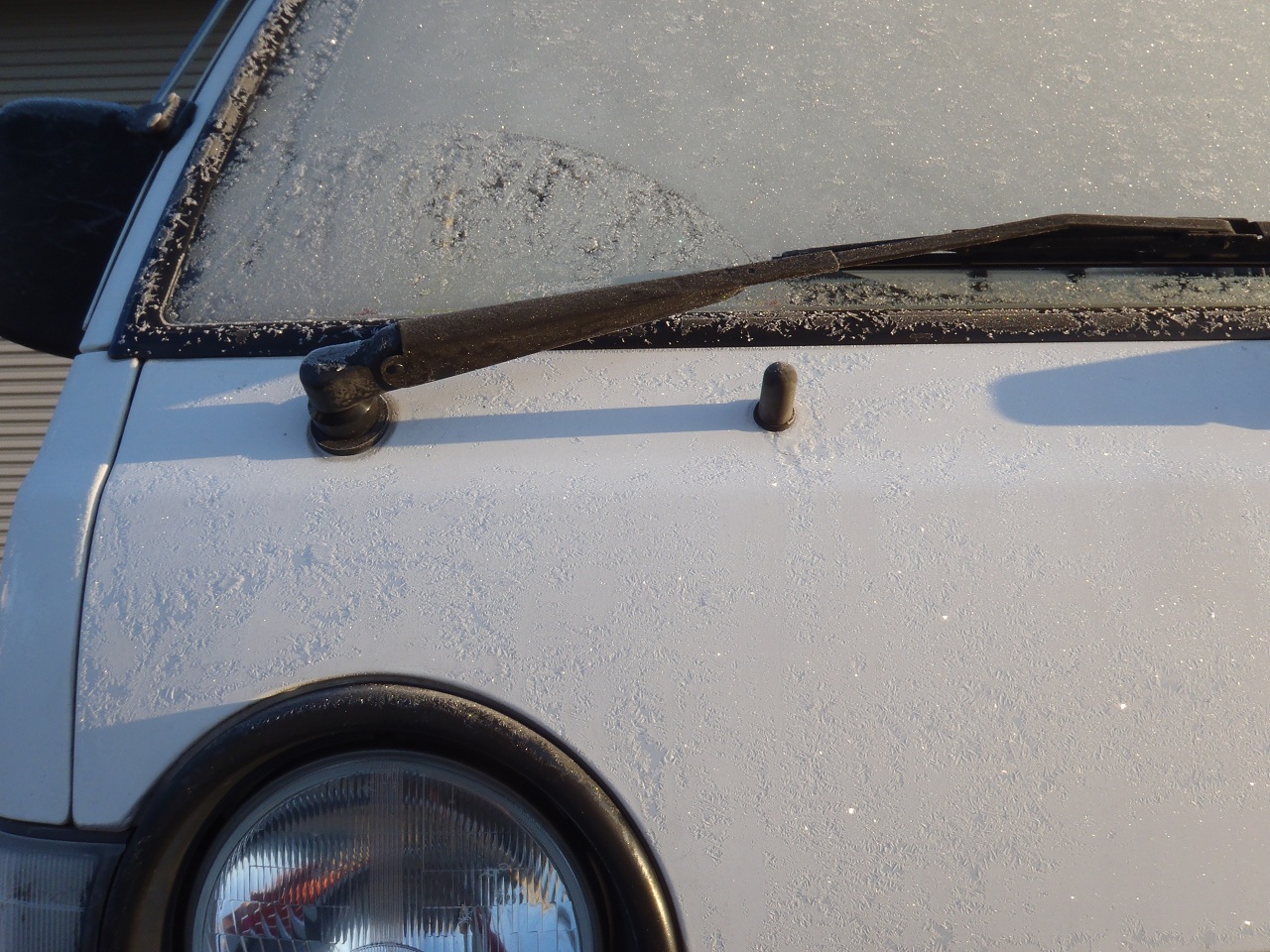 フロントガラスは全面凍ってしまい、サイドミラー、ボディ全面が霜だらけ。