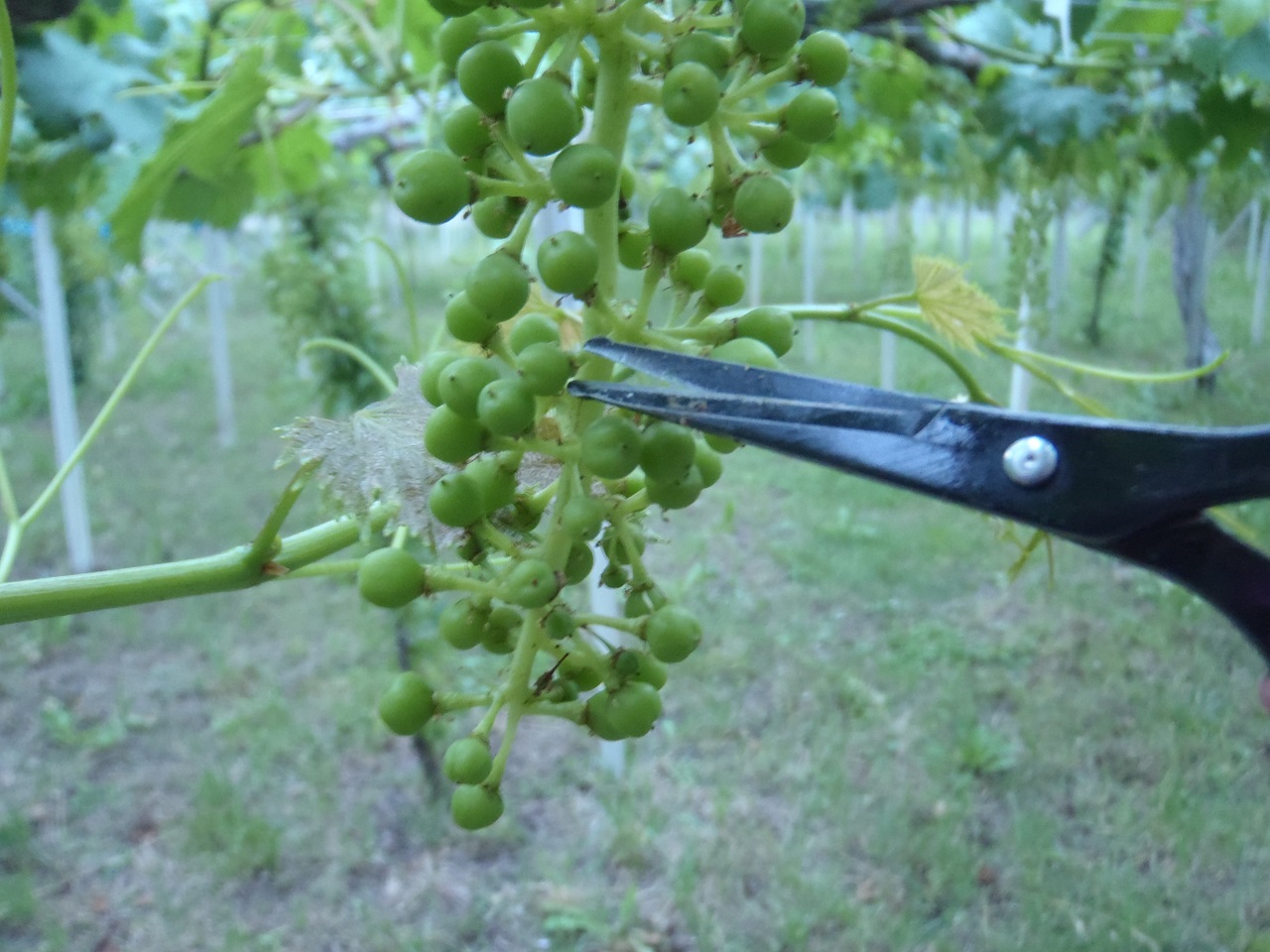 ぶどうの粒が小豆大になったら、先が細いハサミで粒をひとつずつ落としていくんです。