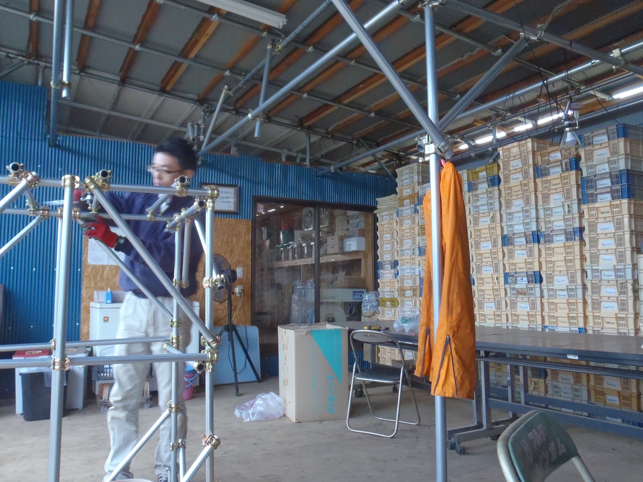 その殺菌室をパイプで組み立てていました。